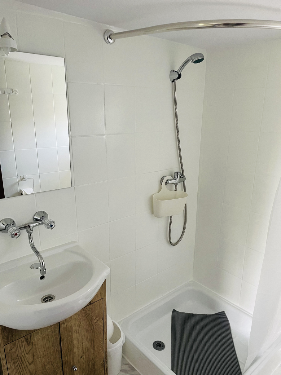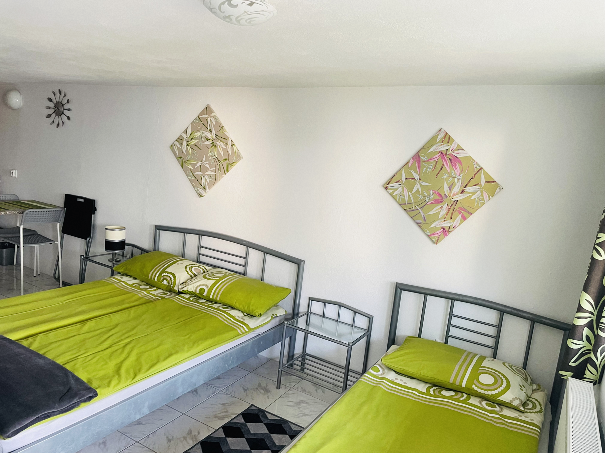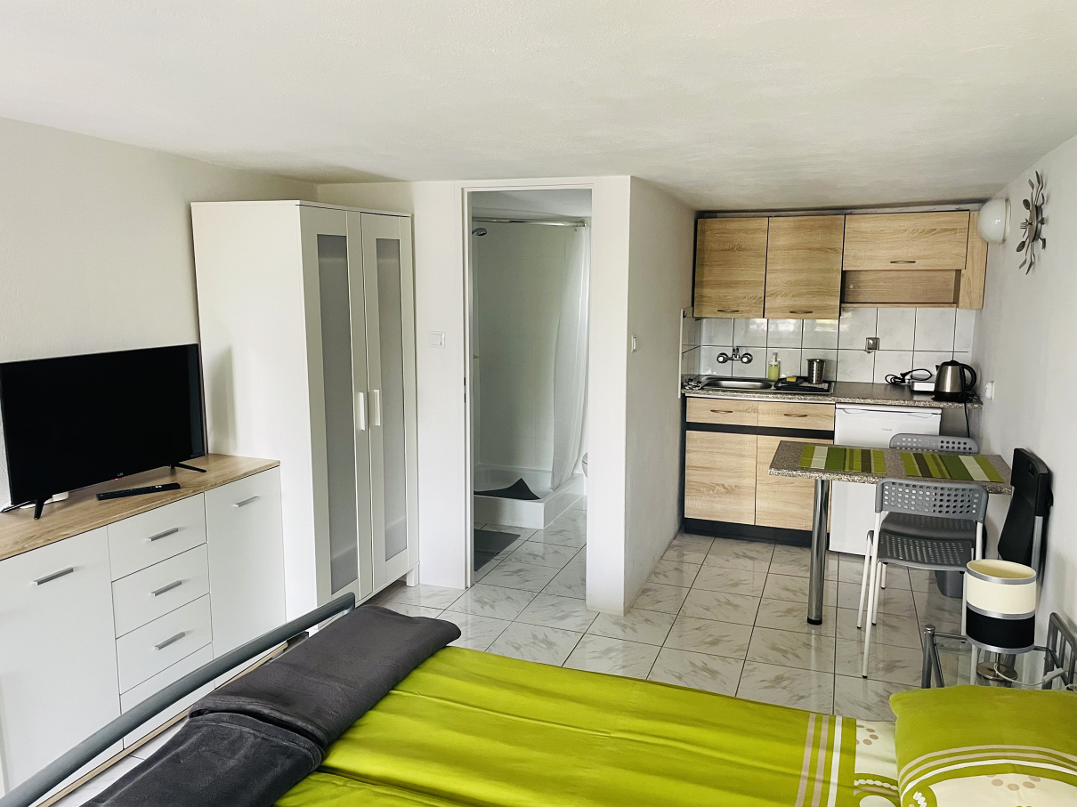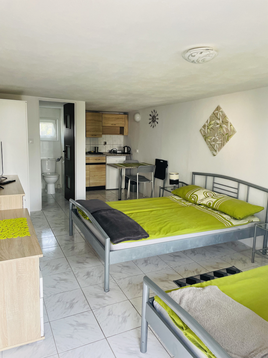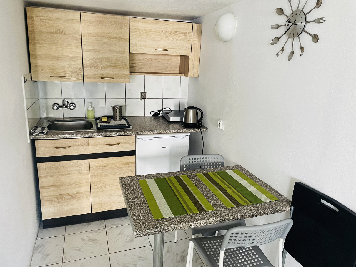 Mieszkanie nr 3 usytuowane jest na piętrze, 1-wsze drzwi z prawej strony. Jest to mieszkanie 2/3 osobowe z aneksem kuchennym oraz łazienką. W pokoju znajduje się 32" telewizor (smart tv) , aneks kuchenny wyposażony jest w kuchenkę, lodówkę oraz czajnik bezprzewodowy. Do dyspozycji gości jest szklany okrągły stół i krzesła znajdujące się przed wejściem do mieszkania.