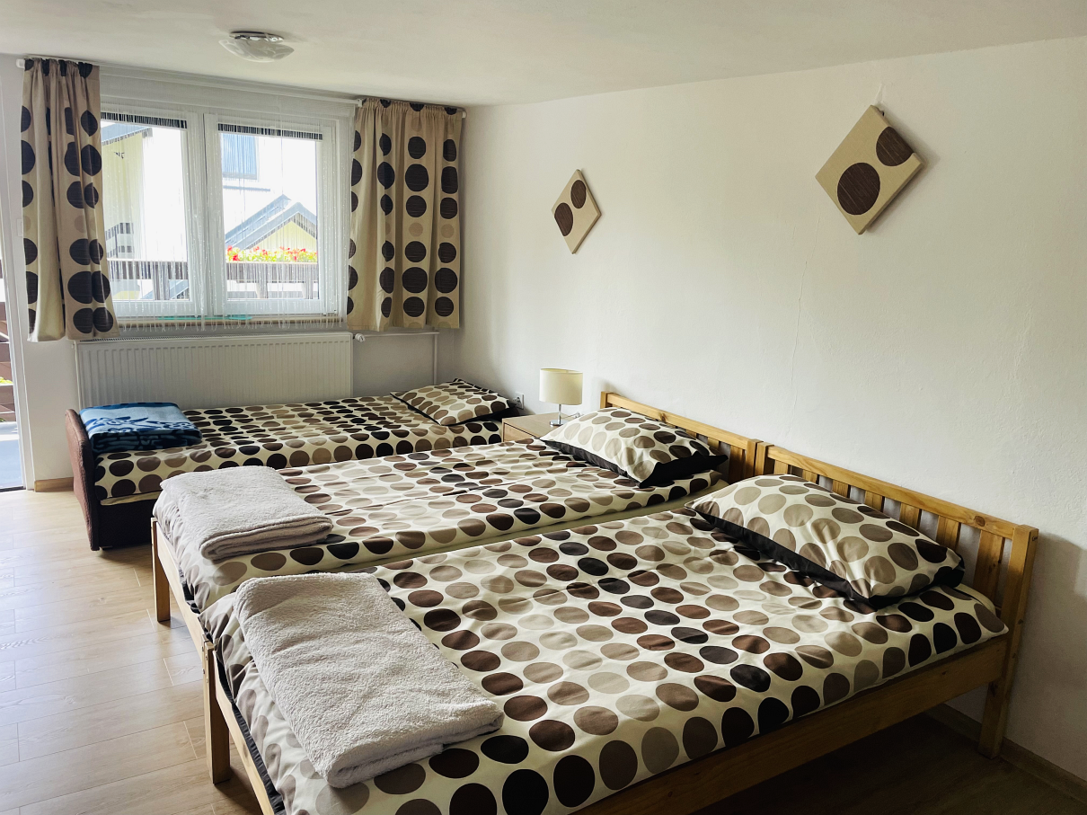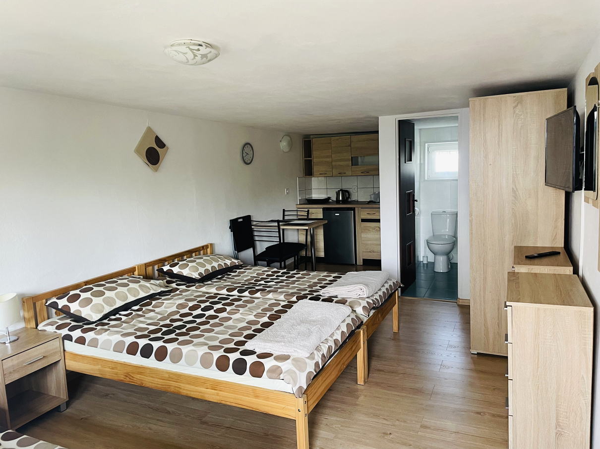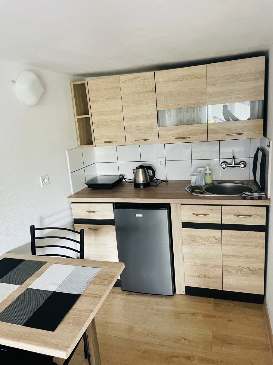 Mieszkanie nr 4 usytuowane jest na piętrze, 2-gie drzwi z prawej strony. Jest to mieszkanie 2/3 osobowe z aneksem kuchennym oraz łazienką. W pokoju znajduje się 32" telewizor (smart tv) aneks kuchenny wyposażony jest w kuchenkę, lodówkę oraz czajnik bezprzewodowy. Do dyspozycji gości jest szklany okrągły stół i krzesła znajdujące się przed wejściem do mieszkania.